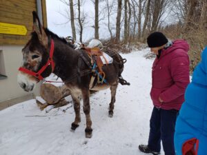 Dort war eine Rast eingeplant, Franz hatte wie schon mehrmals Sekt samt Gläsern im Rucksack, sodaß wir auf unsere Gruppe und ein gutes Jahr 2026 anstoßen konnten. Die Besitzer waren anwesend und diesmal konnten wir sogar ihren Esel streicheln und ein nettes Gespräch führen. Da nach dem Hohlweg wieder einmal ein forstliches Sperrgebiet eingerichtet war, nutzten wir den anderen Weg östlich der Hütte bei dem man am Wohnhaus von Manuel Schmalzl vorbeigeht. Auf der langen Wiese pfiff uns der kalte Wind ordentlich um die Ohren aber alle freuten sich, daß es endlich mal Winter war. Über den Altenburgweg stiegen wir nach Göblasbruck ab, wo wir im Teichstüberl mit gutem Essen freundlich empfangen wurden.
