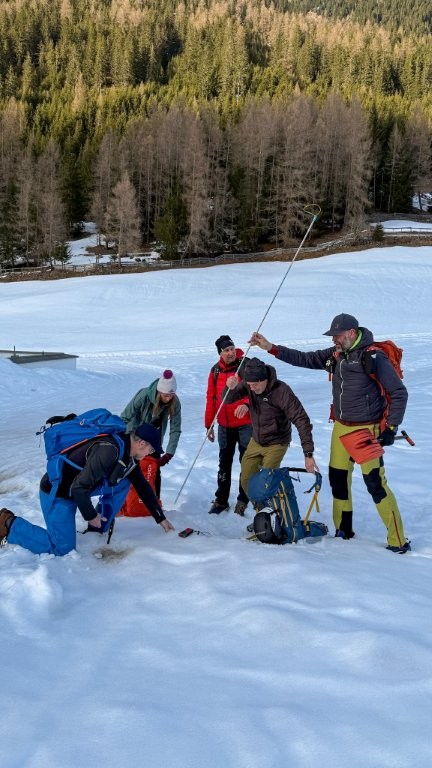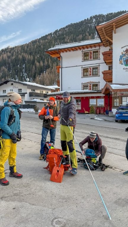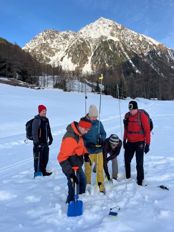 Im Hotel Schöpf in Gries, einem Bergdorf mit 210 Einwohnern auf 1.600m fühlten wir uns sehr gut aufgehoben. Nach der Anreise am Donnerstag, konnten wir bereits die Zimmer beziehen und uns mit der Umgebung anfreunden. Anschließend wurde der Umgang mit dem LVS, Schaufel und Sonde aufgefrischt und mit dem Equipment intensiv trainiert. Alle Teilnehmer zeigten sich hochmotiviert und die Sucherfolge nach den vergrabenen LVS-Geräten stellten sich bald ein.