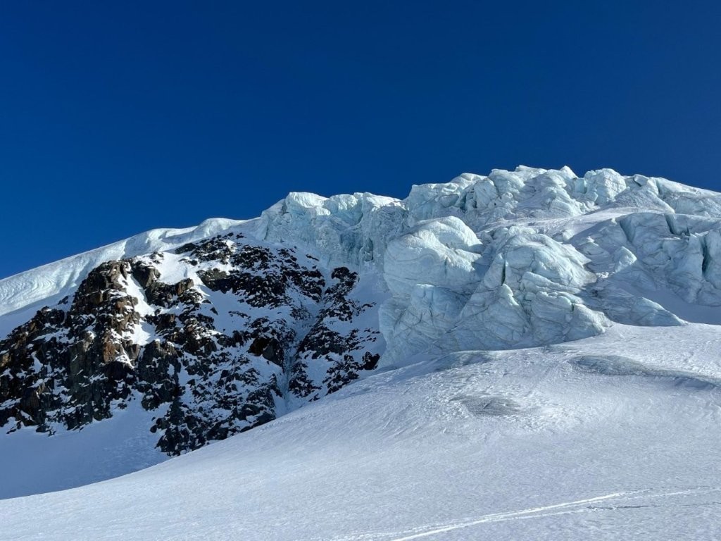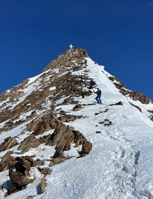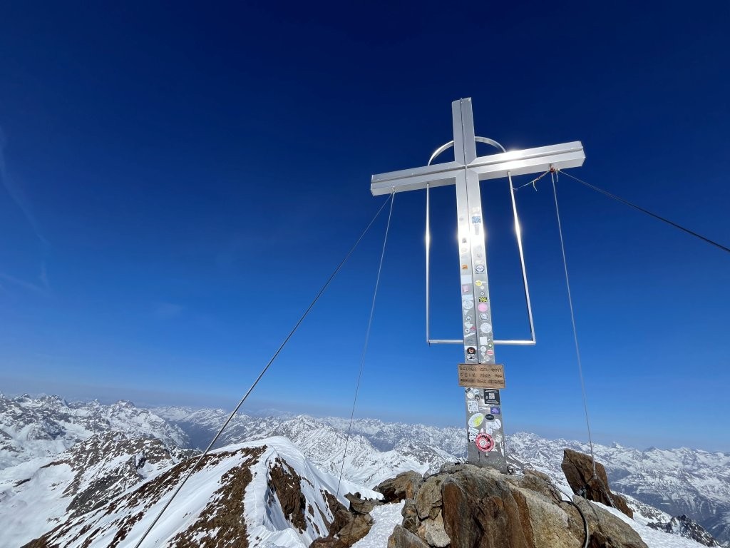 Dort wurde aufgefellt und in 3 Seilschaften ging es über den Taschachferner immer leicht ansteigend Richtung Petersenspitze, der Weg führt durch die Spaltenzonen wo auf 3.350m in einer großen Linkskurve auf die bereits sichtbare Wildspitze zugesteuert wird. Das Steilstück mit wenigen Kehren überwunden zum Skidepot am Fuße des Südwestgrates. Über diesen Grat mit den Steigeisen durch Schnee, Eis und felsdurchsetzte Stellen Richtung Gipfel. Die Schlüsselstelle, knapp vor dem Gipfel ein kurze Felsstufe ist zu überwinden und nicht zu unterschätzen. Alle Teammitglieder konnten den Gipfel erreichen, die Freude war jedem anzusehen, Gänsehautmomente bei Allen!
