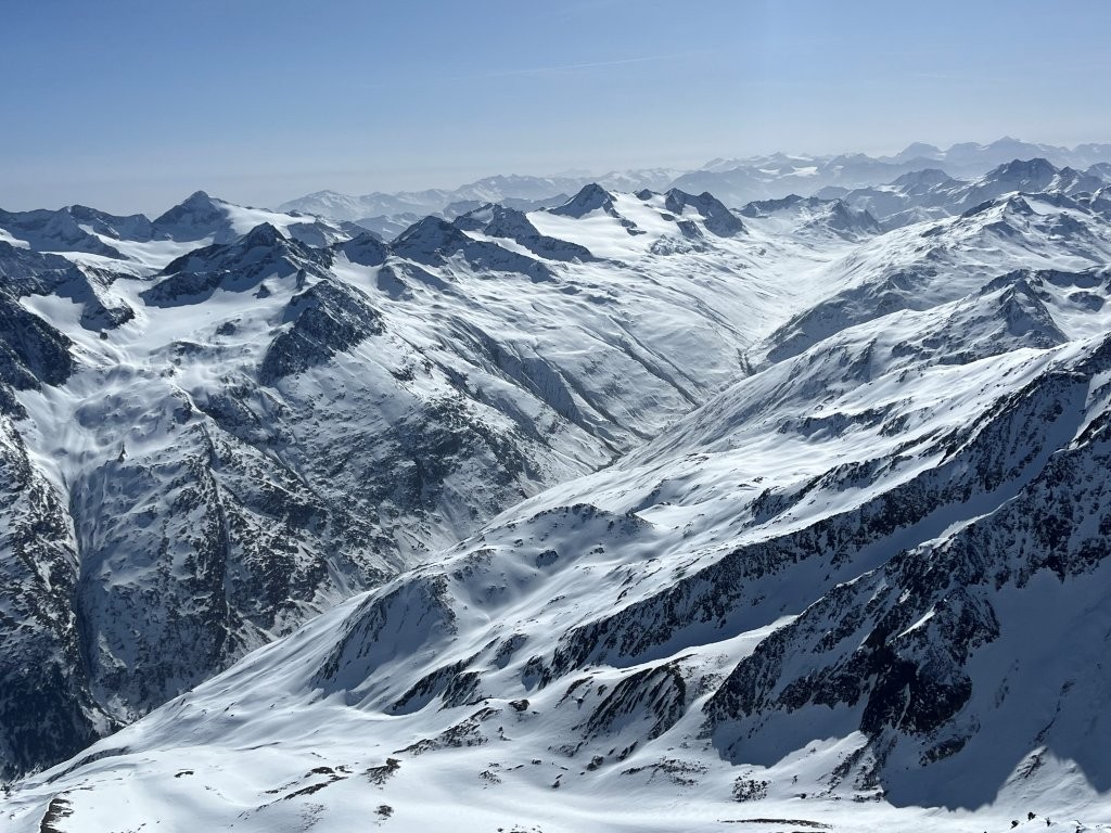 Der Blick schweift über einen Großteil der Tiroler Hochalpen, die Ortlergruppe, bei gutem Wetter und Fernsicht wie wir es hatten auch die Bernina, die Silvretta, das Verwall, Lechtaler Alpen, Wetterstein, Karwendel und Stubai!